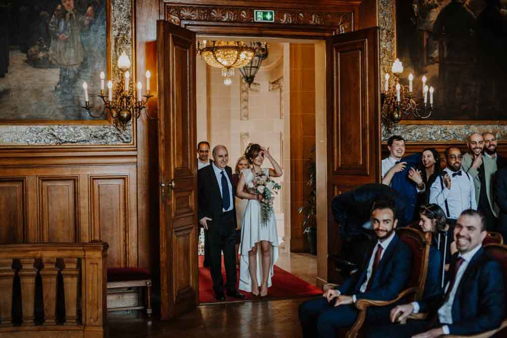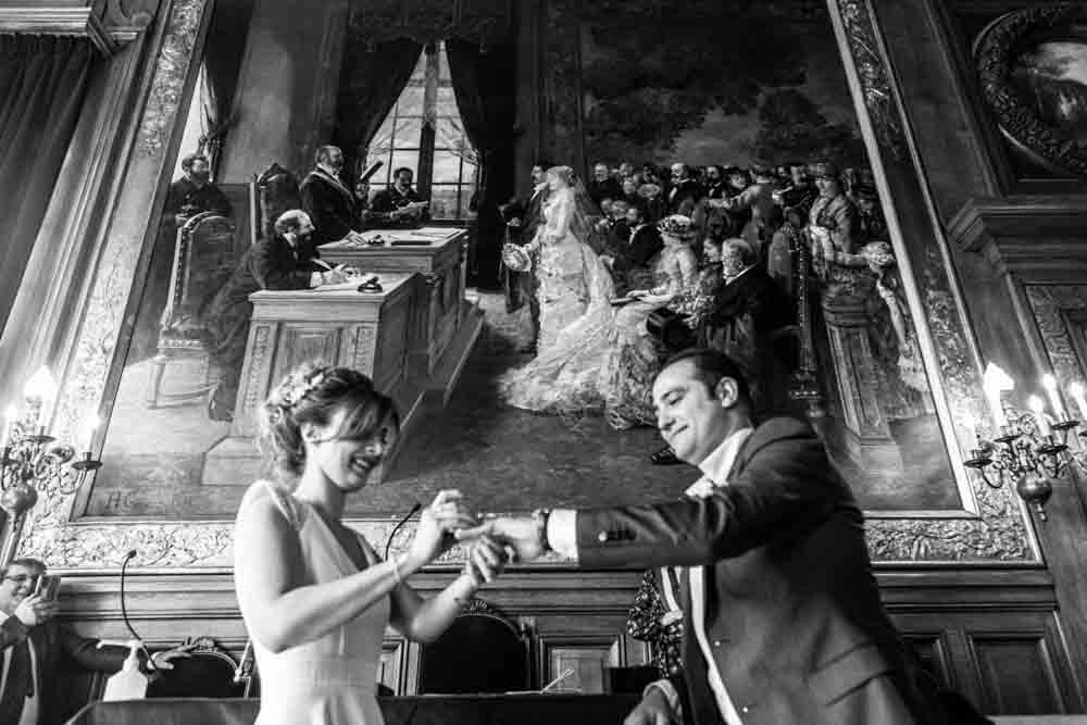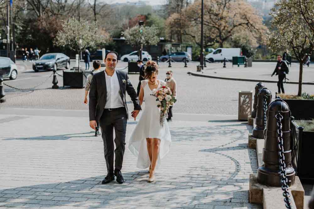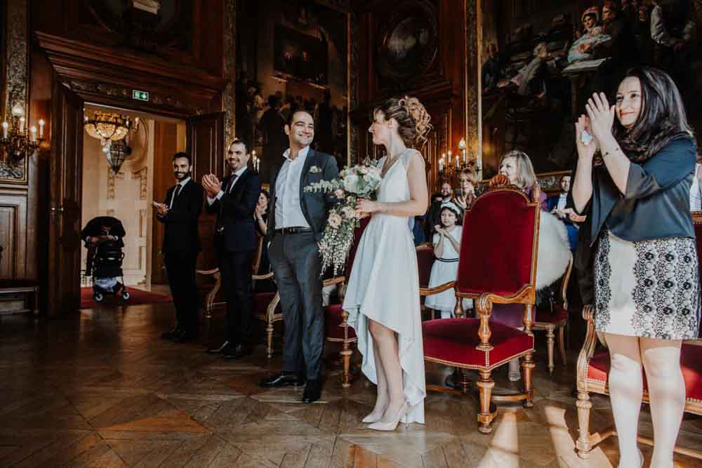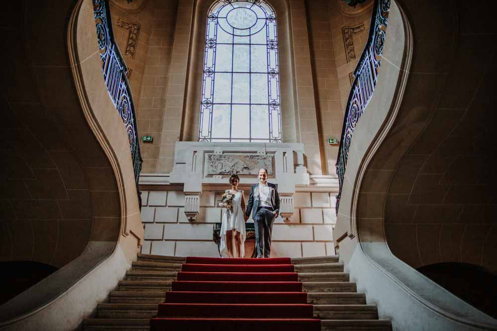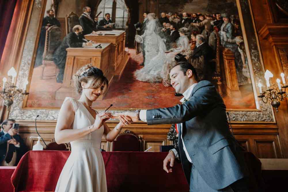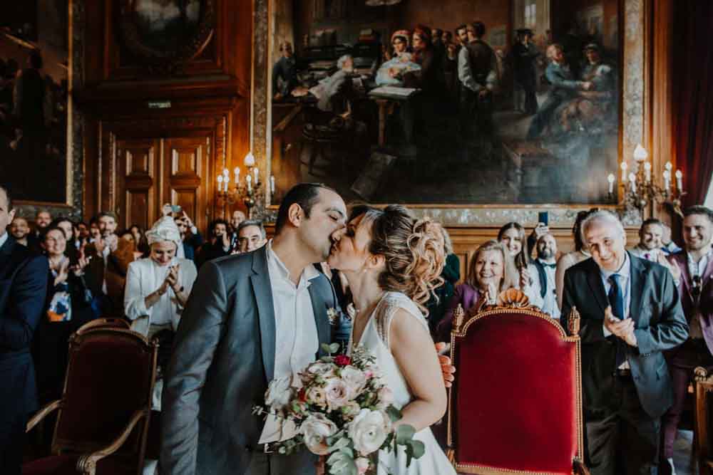 Direction la mairie du XIXème arrondissement, juste en face des Buttes Chaumont pour le first look et la cérémonie civile. Vous savez que cette mairie a une spécificité pour les jeunes mariés ? c’est la seule mairie parisienne dont la décoration de la salle de mariage a pour un thème… le mariage ! En effet, une magnifique peinture d’une cérémonie civile est sur le mur juste au dessus du bureau de monsieur le maire. C’est aussi une des plus belles mairies de Paris.