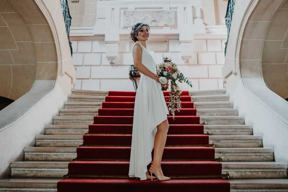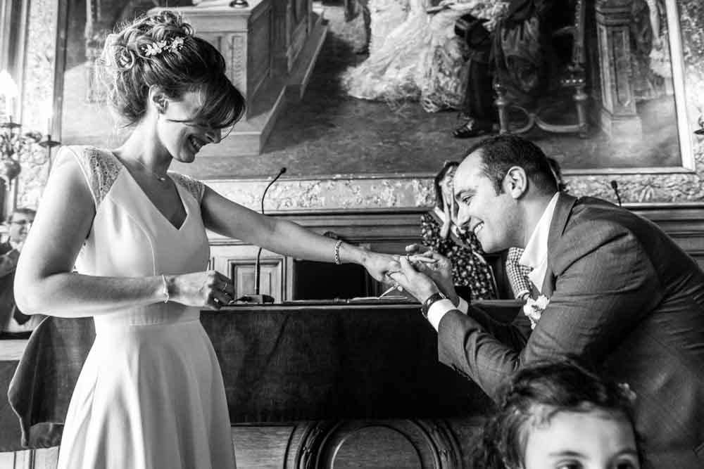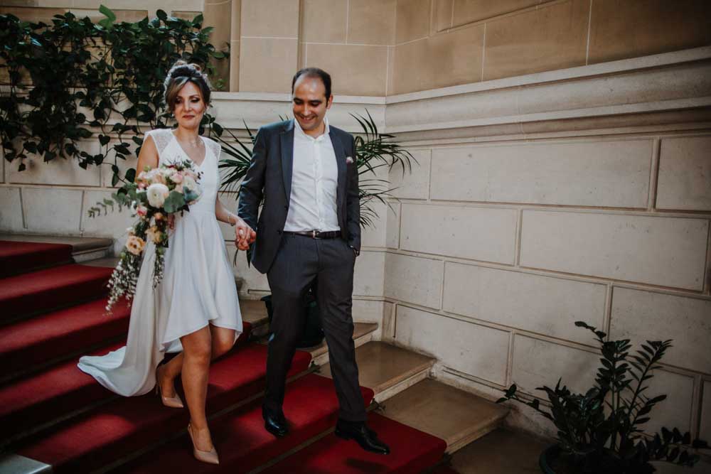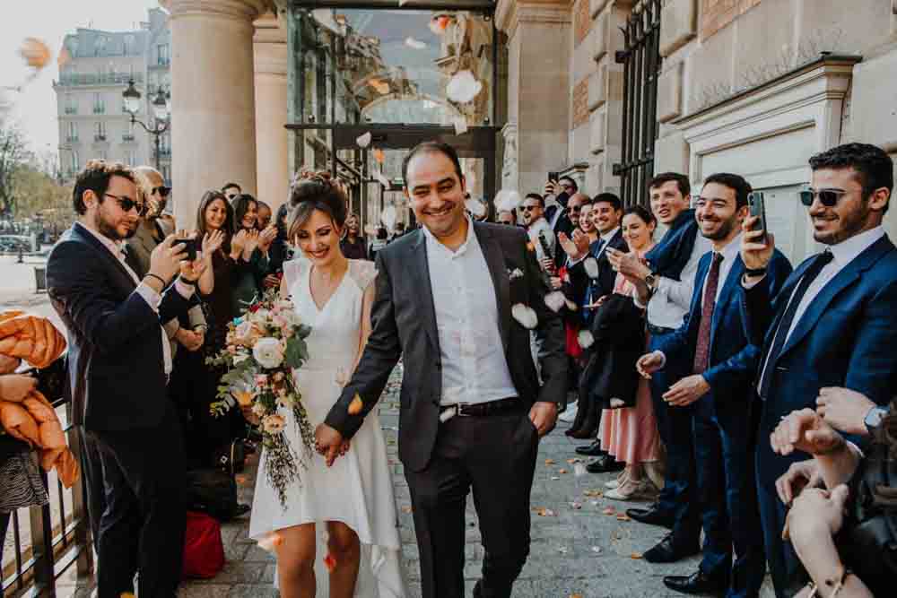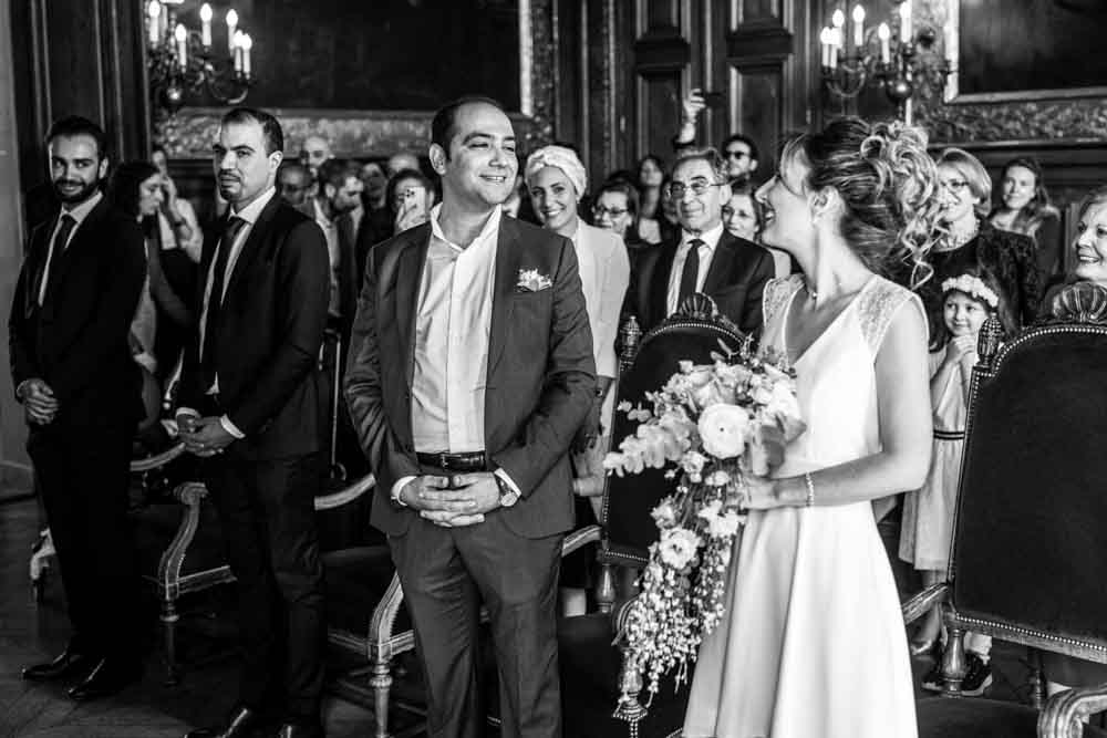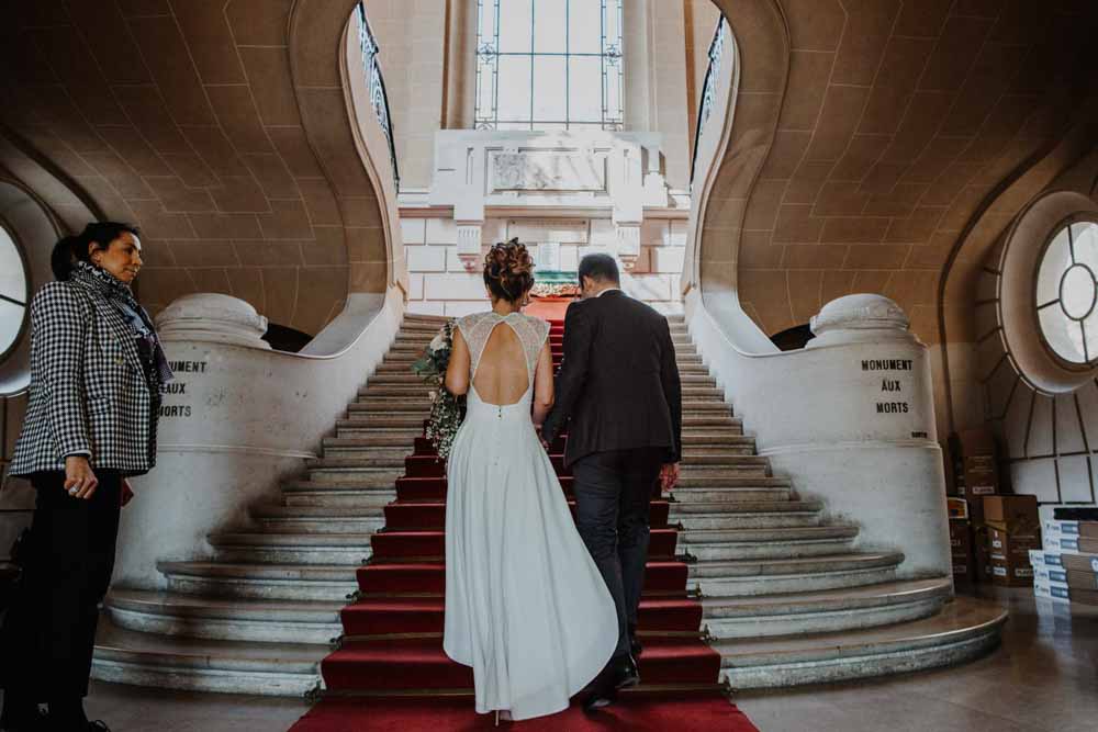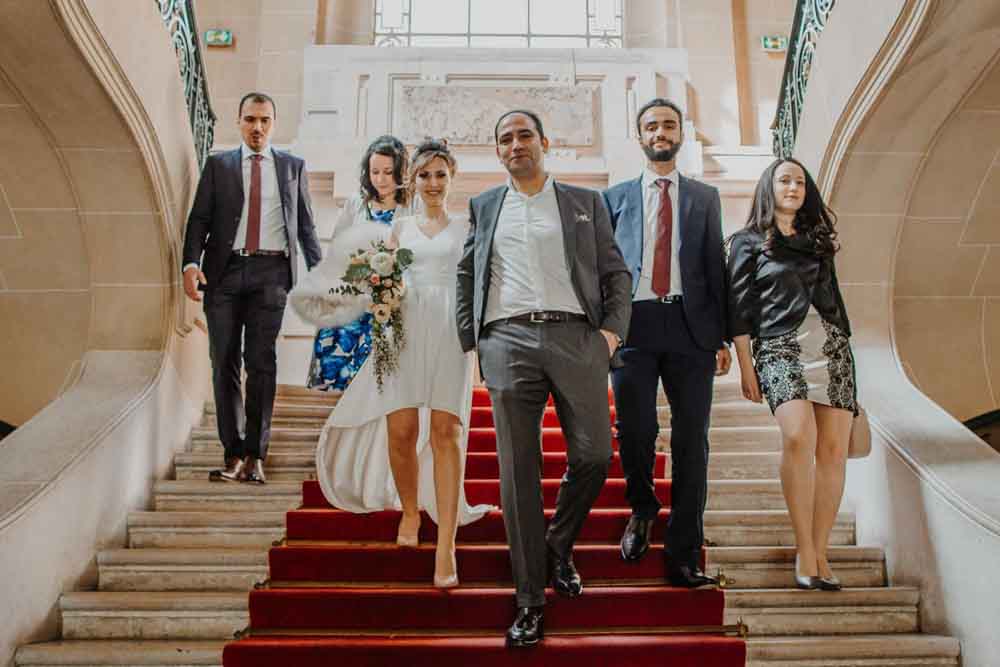 Direction la mairie du XIXème arrondissement, juste en face des Buttes Chaumont pour le first look et la cérémonie civile. Vous savez que cette mairie a une spécificité pour les jeunes mariés ? c’est la seule mairie parisienne dont la décoration de la salle de mariage a pour un thème… le mariage ! En effet, une magnifique peinture d’une cérémonie civile est sur le mur juste au dessus du bureau de monsieur le maire. C’est aussi une des plus belles mairies de Paris.
